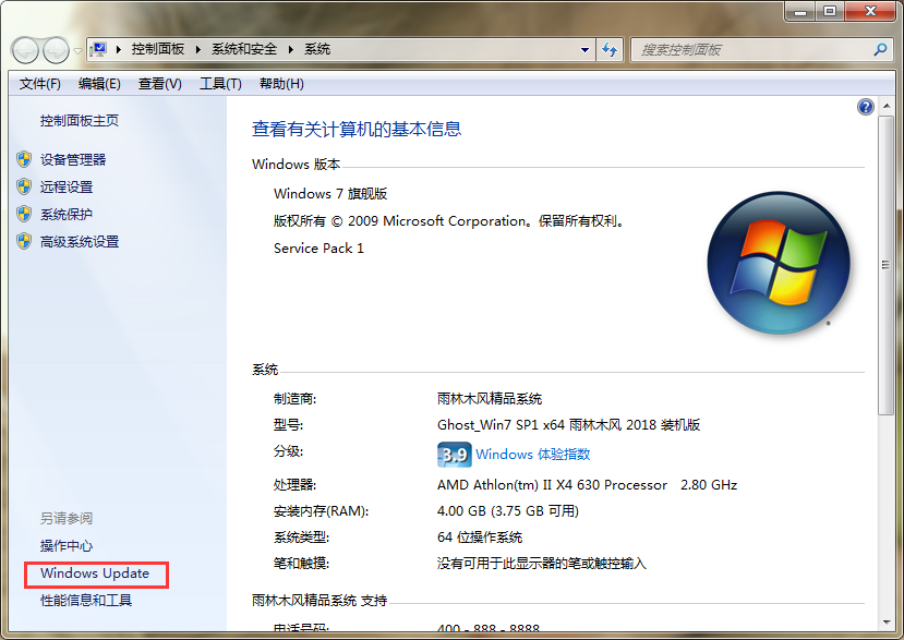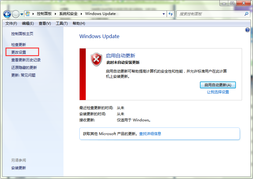 4、接下来,在打开的“系统”窗口中选择左侧的“Windows update”。然后再在打开的“Windows update”窗口左侧选择“更改设置”。如图所示: