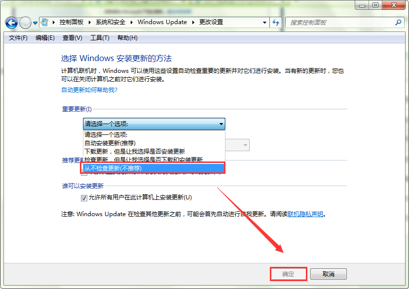5、最后,再在更改设置窗口下“重要更新”下拉列表选择到“从不检查更新(不推荐)”即可。如图所示: