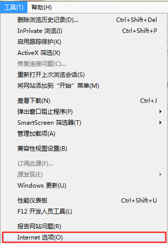 1、首先,打开IE浏览器,然后在工具栏处点击“工具”——“Internet选项”。如图所示:
