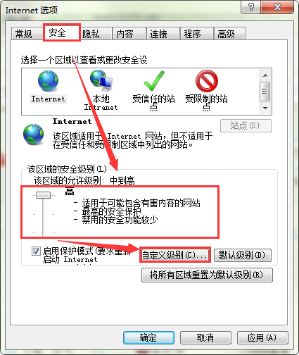 2、接下来,在打开的“Internet选项”窗口,切换至“安全”选项卡。然后点击页面中的“自定义级别”。如图所示: