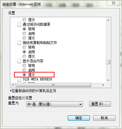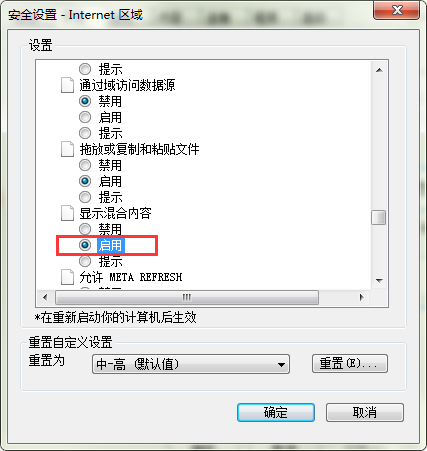 3、最后,在打开的“安全设置-Internet区域”窗口,下拉至“显示混合内容”,将其状态从“提示”修改为“启用”,按“Enter”确定即可。如图所示: