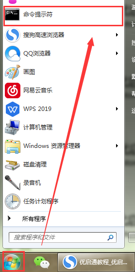 1、首先,点击桌面左下角的“开始菜单”,在列表中找到并打开“命令提示符”。如图所示: