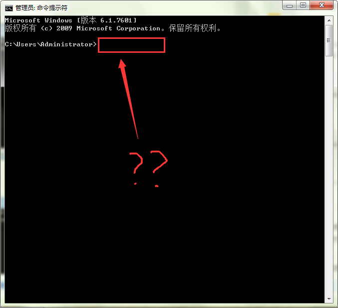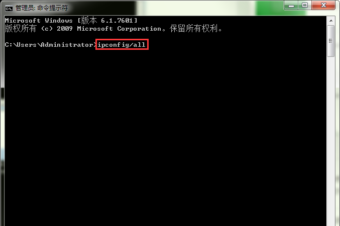 2、打开“命令提示符”窗口后,我们可以看到页面方框处是空白的。接下来,我们则需要在图示方框处输入“ipconfig /all”命令,按“Enter”确定即可。如图所示: