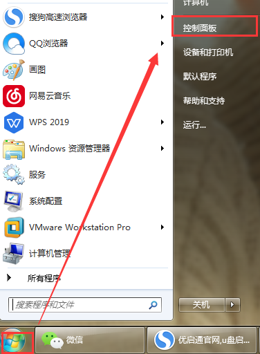 1、首先,点击桌面左下角的“开始菜单”,然后选择打开“控制面板”。如图所示: