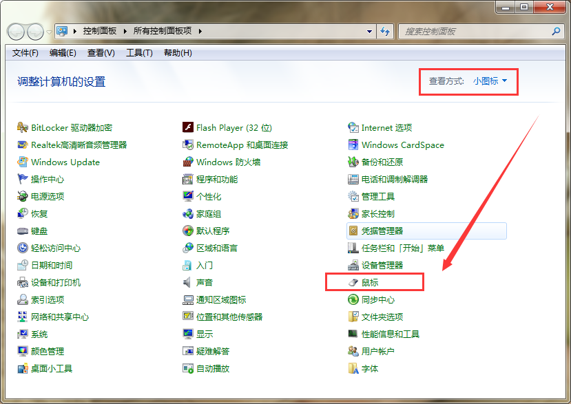 2、接下来,在打开的控制面板窗口将查看方式切换至“小图标”,找到并点击打开“鼠标”选项。如图所示: