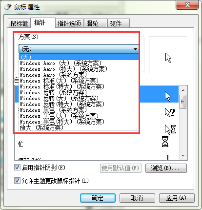 4、在“鼠标属性”窗口,我们可以下拉“方案”选择您需要的鼠标大小配色方案。如图所示: