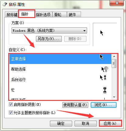 5、我们选择了“方案”后,还可下拉“自定义”选择我们需要的鼠标样式,点击“应用”保存即可。如图所示: