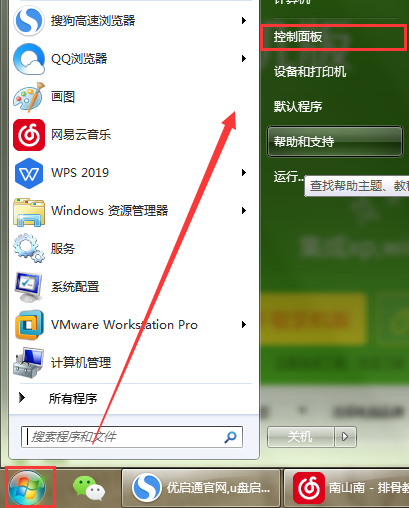 1、首先,点击桌面左下角的“开始菜单”,选择并打开“控制面板”。如图所示: