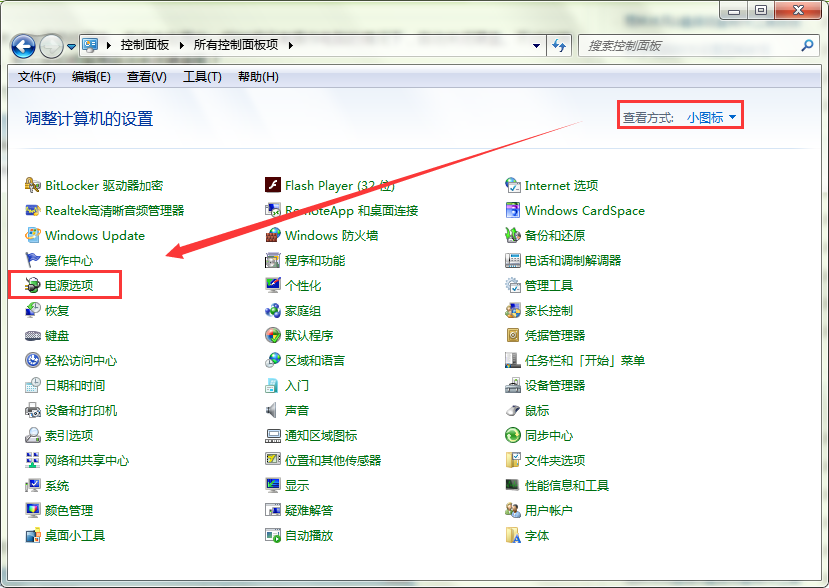 2、然后,在打开“所有控制面板项”窗口后,在右上侧荀泽查看方式为“小图标”,然后再选择打开“电源选项”。如图所示: