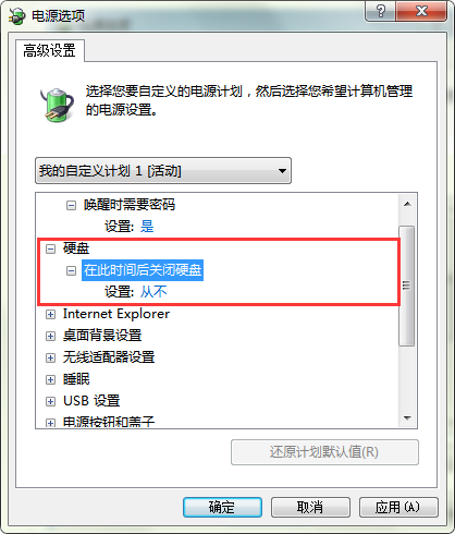 4、最后,在打开的“电源选项”窗口中,选择“硬盘”——“在此时间后关闭硬盘”——“从不”即可。如图所示: