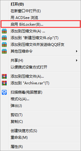 2、选择要加密的可移动磁盘,点击右键选择“启用BitLocker”;