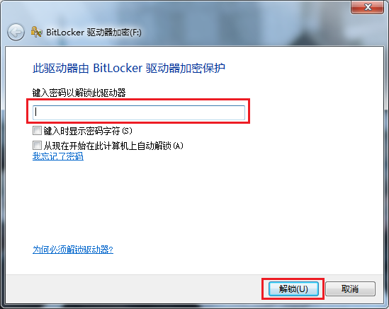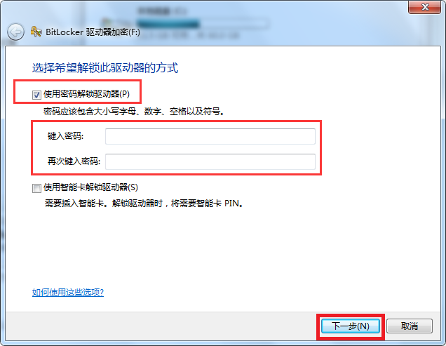 7、在窗口中“键入密码以解锁此驱动器”下方框中填入您想设置的密码;