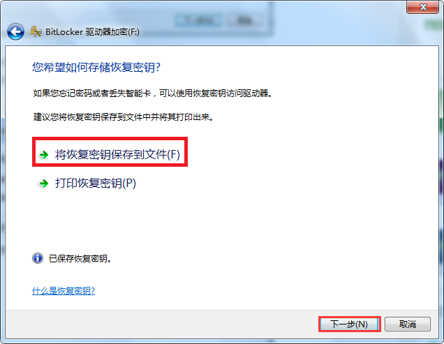 4、选择“将恢复密钥保存到文件”;“将恢复密钥保存到文件”即指将一串解密字符保存在文本里,供用户忘记密码时解密,但如果用户忘记了密码,且没有字符,格式化u盘将会是你唯一的选择;