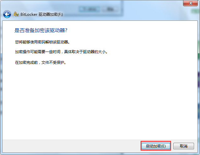 5、在“BitLocker驱动器加密”窗口,点击“启动加密”;(设置成功后,将文件存储到u盘时u盘会自动对新存入的文件进行加密)