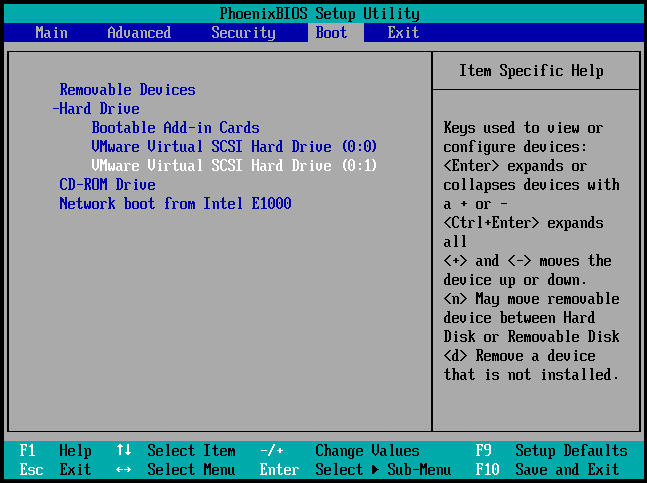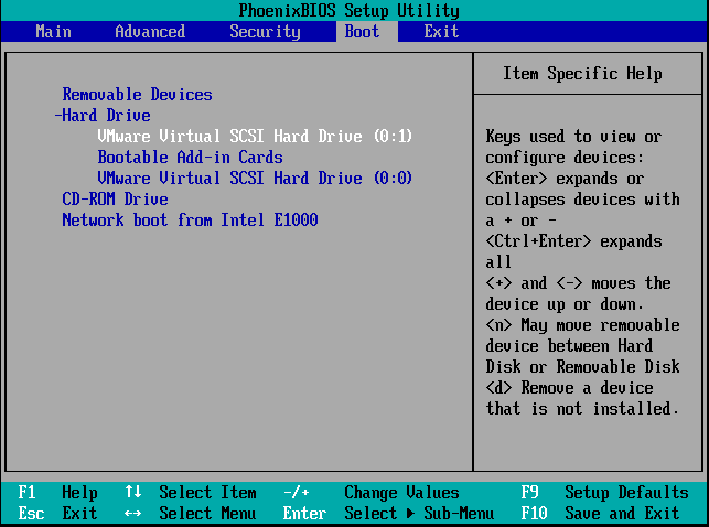 选择Boot下“Hard Drive”下的“UMuare virtual..(0:1)”按“Shift ”+“ +”将其调都最顶端位置即可,如图;