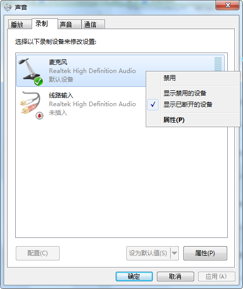 2、将鼠标光标置于麦克风选项上,点击右键选择“属性”,如图所示;