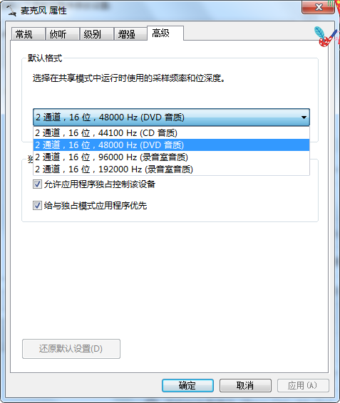 3、在跳出对的“麦克风属性”窗口选择“高级”选项,然后在“默认格式”下,自由选择音质质量(慢慢提升品质,选择到您觉得合适的话,就不用在提高了)如图所示;