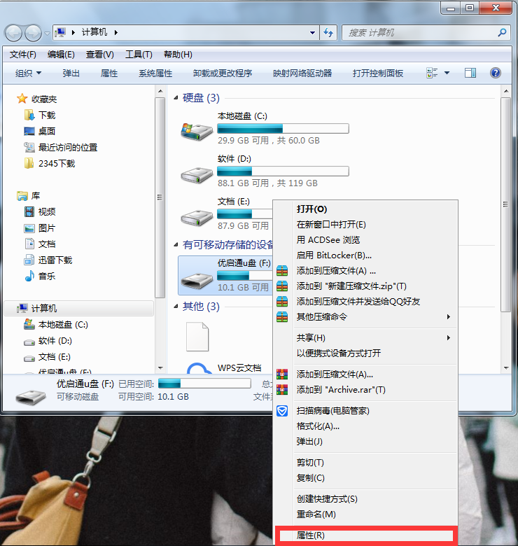 1、首先,打开桌面“计算机”图标,选择可移动磁盘(优启通U盘),右击选择“属性”,如图所示: