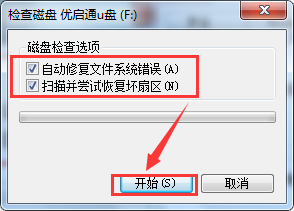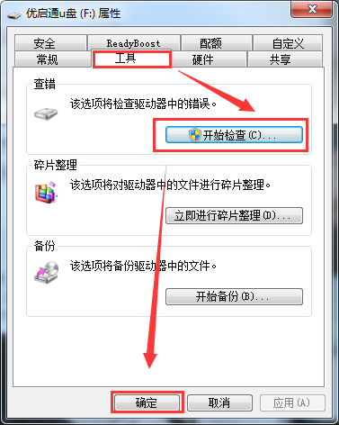2、在打开的“优启通U盘属性”窗口,选择“工具”选项下的“开始检查”,如图所示: