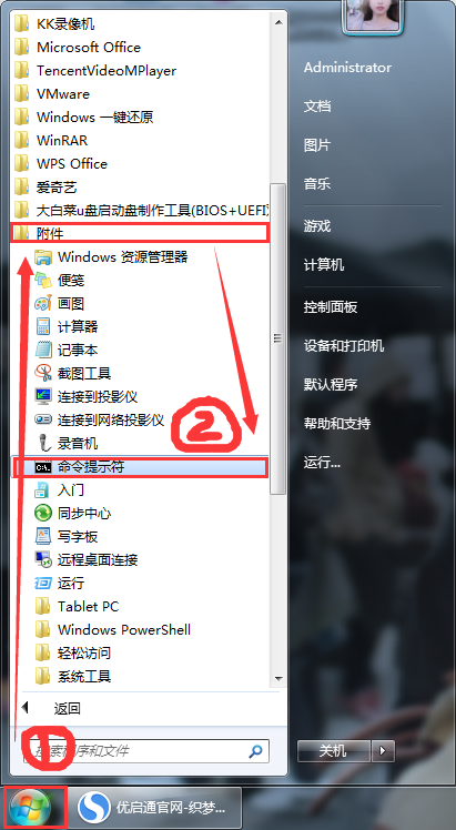 1、首先,点击桌面左下角“开始菜单”图标,选择“所有程序”下的附件“命令提示符”。如图所示: