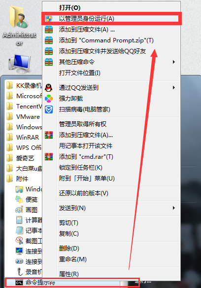 2、选择“命令提示符”,鼠标点击右键,选择“以管理员身份运行”,如图所示: