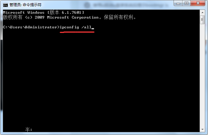3、在打开的“命令提示符”窗口输入“ipconfig /all”命令,如图所示: