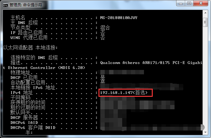 4、该命令可以获取本机的IP地址信息,如图所示: