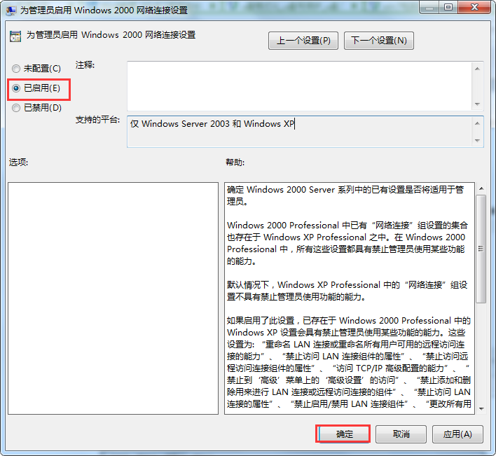 4、在打开的“为管理员启用Windows 2000网络连接设置”窗口,将状态设置为“已启用”,按“Enter”键确定。如图所示: