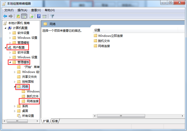 2、在本地组策略编辑器界面选择“用户配置”--“管理模板”--“网络”--“网络连接”。如图所示: