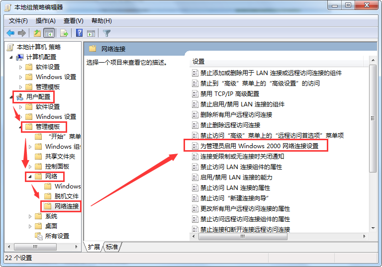 3、在“网络连接”选项右侧找到并双击打开“为管理员启用Windows 2000网络连接设置”属性。如图所示:
