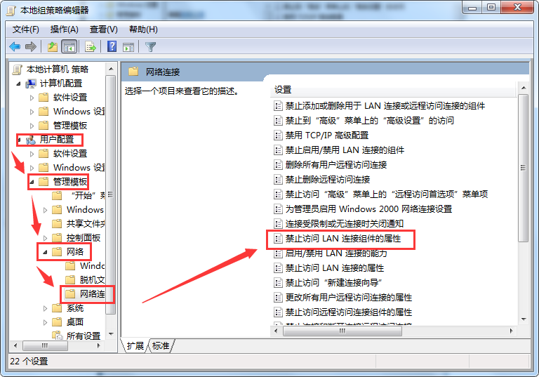 5、修改好上一项后,我们还需设置另外一项内容。返回“本地编辑器”界面找到并双击打开“禁止访问LAN连接组件的属性”。如图所示: