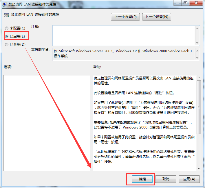 6、在打开的“禁止访问LAN连接组件的属性”窗口,将状态设置为“已启用”,按“Enter”键确定即可。如图所示: