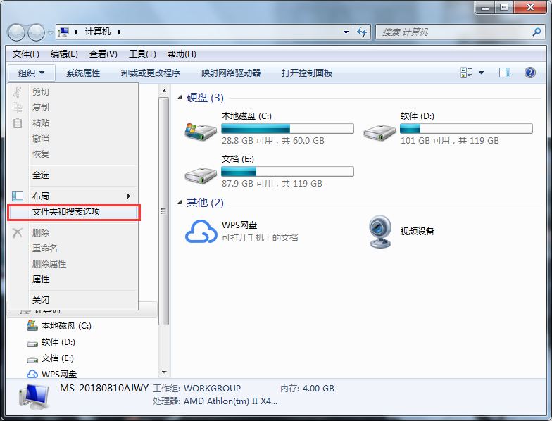 2、在打开的计算机窗口中,选择“组织”--“文件夹和搜索选项”。如图所示: