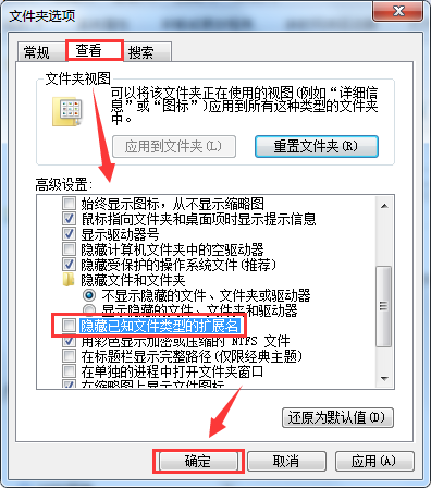 3、在打开的“文件夹选项”窗口下,找到并取消勾选“高级设置”中的“隐藏已知文件类型的扩展名”。如图所示: