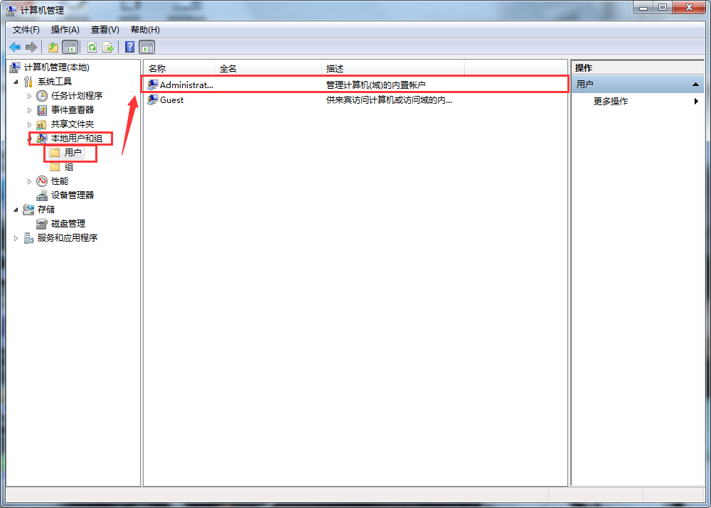 2、接下来,在打开的“计算机管理”窗口左找到“本地用户和组”--“用户”,然后双击打开窗口右侧的“Administrator”选项。如图所示: