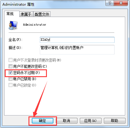 3、打开“Administrator”属性窗口后,勾选“密码永不过期”选项,按“Enter”键确定即可。如图所示:
