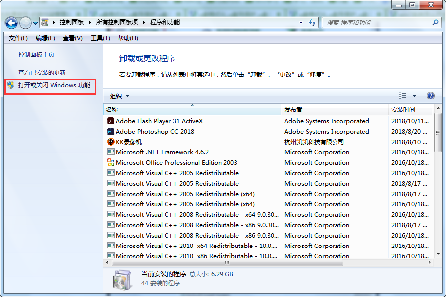 3、在打开的“程序与功能”窗口左侧选择“打开或关闭Windows功能”。如图所示: