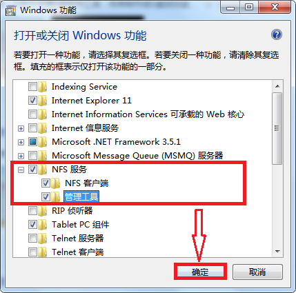 4、在“Windows 功能”窗口中,勾选“NFS服务”下拉的所有选项,按“Enter”键确定。如图所示: