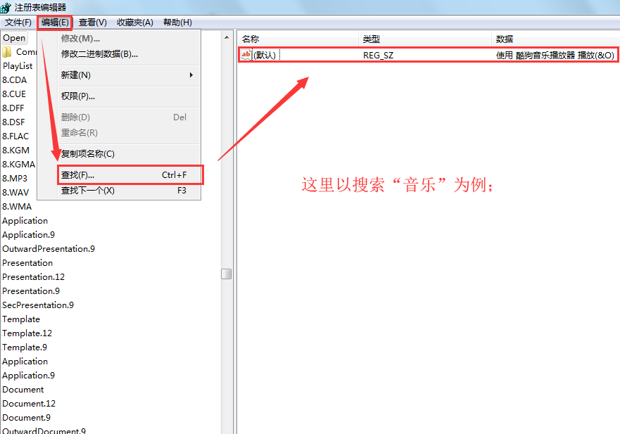 2、打开“注册表编辑器”后将鼠标置于“编辑”选项卡上,点击打开“查找”。如图所示: