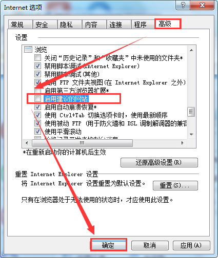 3、最后,在打开的“Internet选项”窗口,将选项卡切换至“高级”,然后在设置选项下找到并取消选择“启用建议的网站”即可。如图所示: