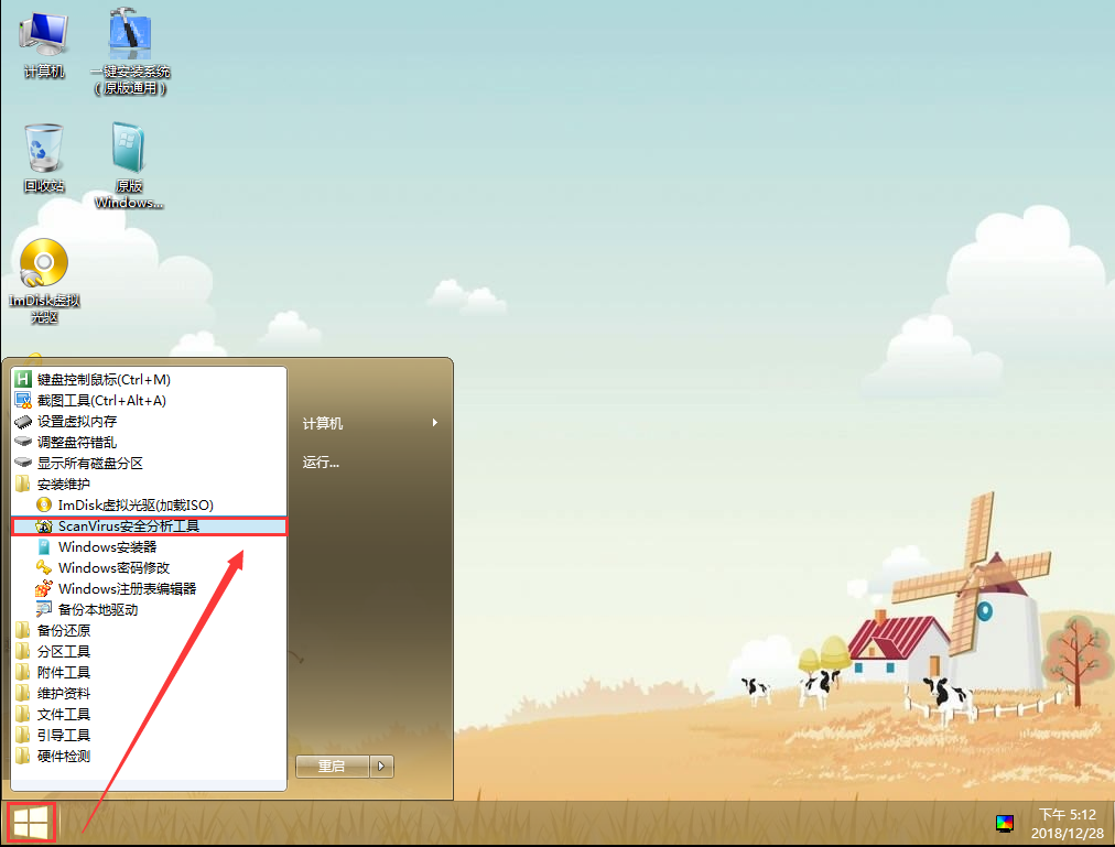 3、PE启动后,自动加载进入到PE系统桌面。单击桌面左下角的“开始菜单”——“安装维护”——“ScanVirus安全分析工具”。如图所示: