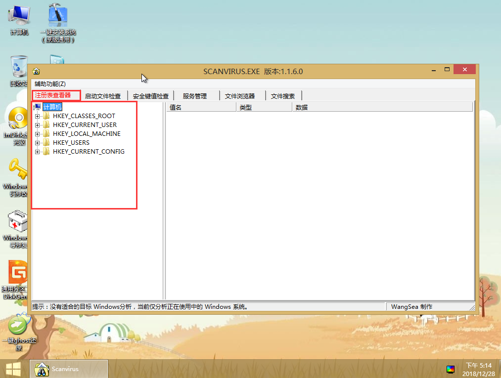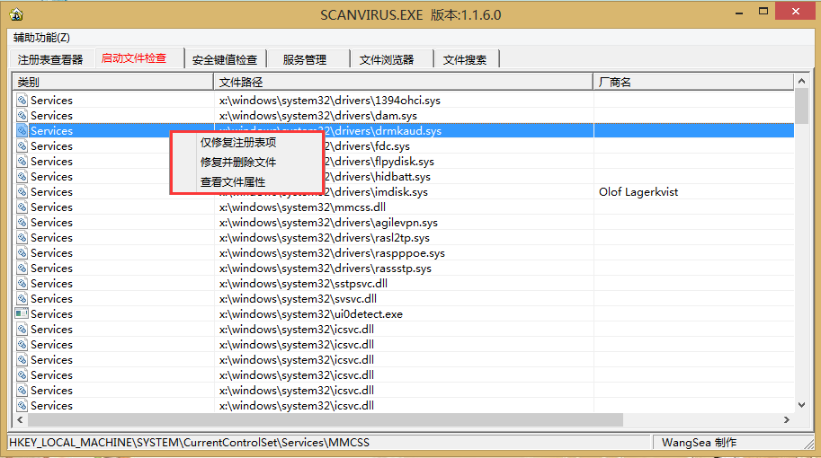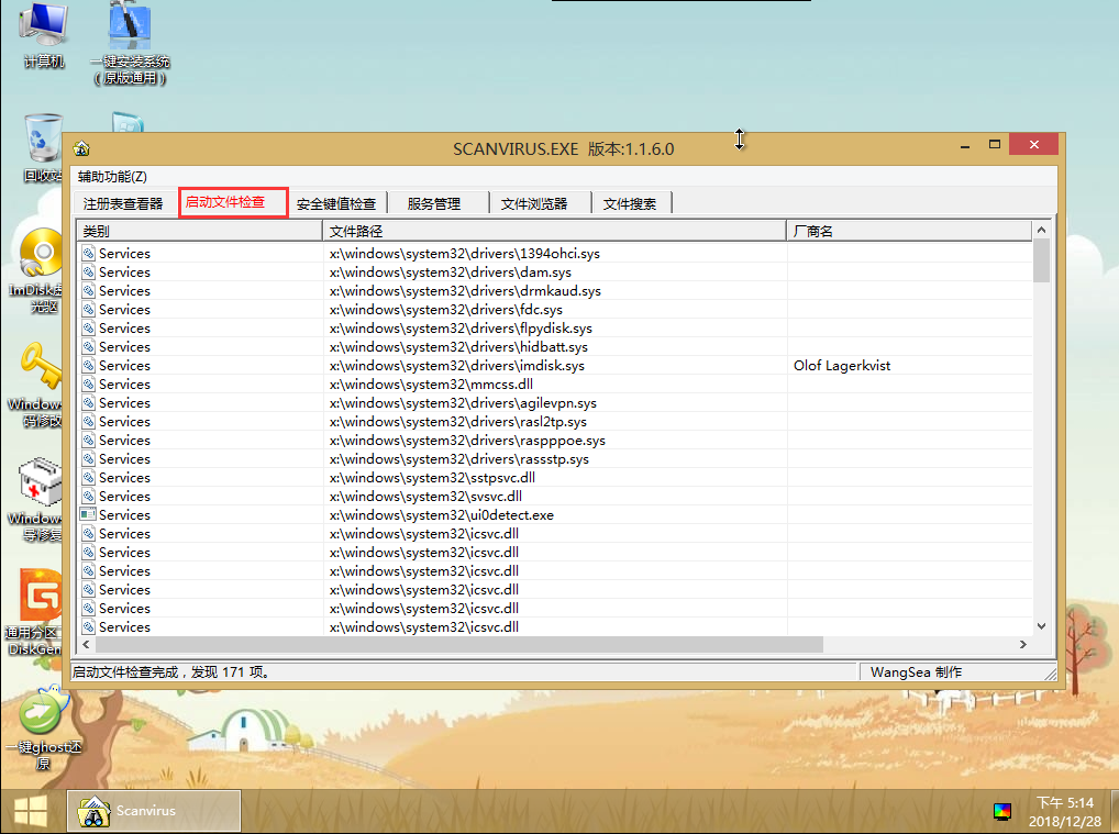 5、如图,我们可以看到scanvirus系统安全分析工具主界面,其中有“注册表查看器”、“启动文件检查”、“安全键值检查”、“服务管理”、“文件浏览器”、“文件搜索”这六个菜单应用。如图所示(在此我们以列举操作“启动文件检查”为例):