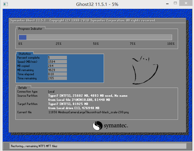第六步:此时弹出GHOST还原界面,此过程约需2~3min,耐心等待完成: