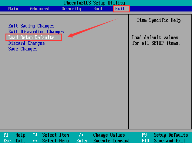 第一步:进入BIOS设置后,将选项卡切换至“Exit”,再按“↑”“↓”方向键选择到“Load Setup Dwfaults”。如图所示: