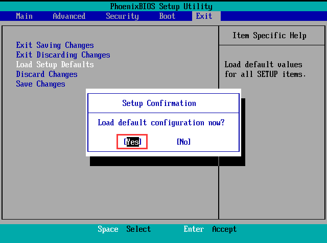 第二步:选择到“Load Setup Dwfaults”后,当跳出“Setup Confirmation”窗口后,按“←”“→”方向键选择“yes”,再按“Enter”键确定。如图所示: