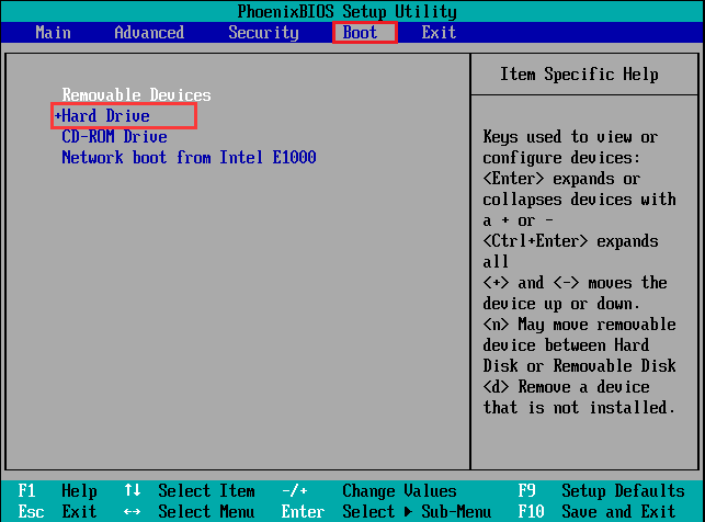 2、将选项卡切换至Boot后,按“↑”“↓”方向键到“Hard Drive”选项,然后按“Enter”键确定打开“Hard Drive”。如图所示: