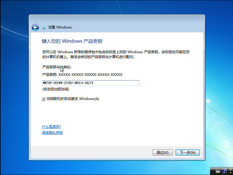 第九步:输入产品密钥(自行在网上搜索),输入后点击下一步;