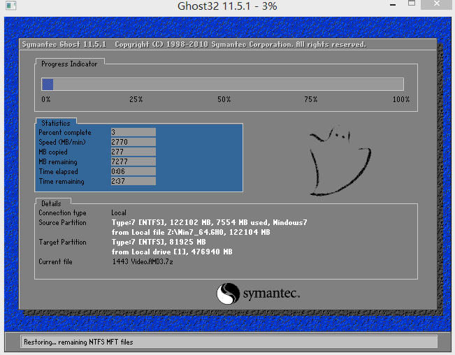 6、此时弹出GHOST还原界面,此过程约需2~3min,耐心等待完成,如图所示:
