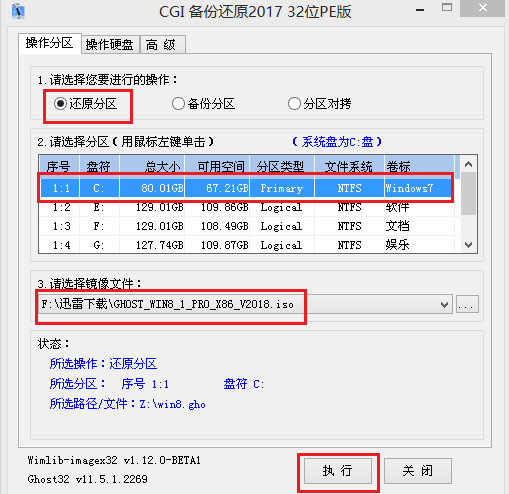 第四步:在弹出窗口中,镜像文件应为U盘中所准备的WIN8系统镜像,可参照下图方式选择,点击“执行”: