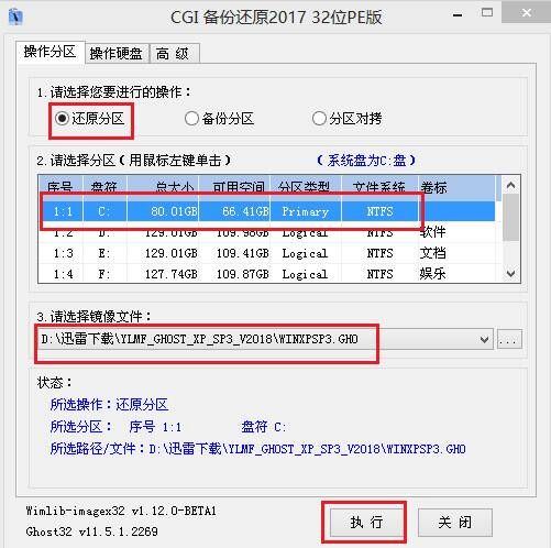 第四步:在弹出窗口中,镜像文件应为U盘中所准备的WINXP系统镜像,可参照下图方式选择,点击“执行”: